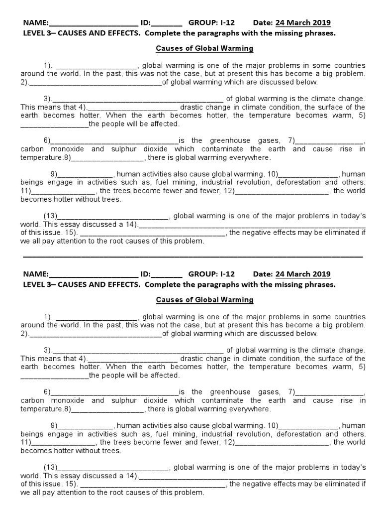 Level 3 Causes Effects Cloze Global Warming Global Warming Greenhouse Effect