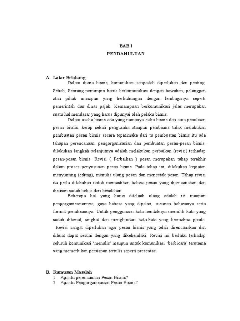 Makalah perencanaan pesan bisnis. BAB I PENDAHULUAN Perencanaan bisnis merupakan satu langkah strategis bagi pencaaian tujuan suatu organisasi secara menyeluruh. Makalah ini akan menjelaskan tentang perencanaan pesan-pesan bisnis yang difokuskan pada perencanaan pesan-pesan bisnis secara tertulis. Menulis pesan bisnis 3.