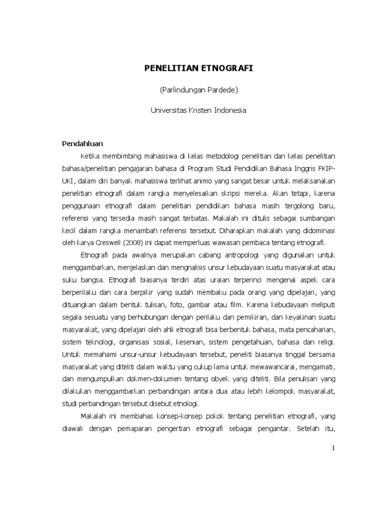 Keneth Toumahuw Kelas. Adapun untuk contoh yang bisa dipergunakan dalam riset etnografi. Contoh riset etnografi Definisi etnografi Etnografi ialah jenis metode penelitian yang diterapkan untuk mengungkap makna sosio-kultural dengan cara mempelajari keseharian pola hidup dan interaksi kelompok sosio-kultural culture-sharing group tertentu dalam ruang atau konteks yang spesifik.